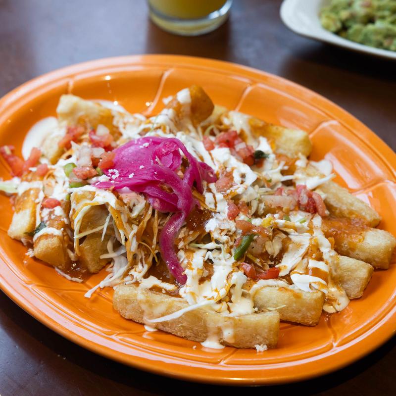 Fried yuca served with Honduran slaw, homemade tomato sauce & creamy dressing topped with pickled onions & shredded cheese.